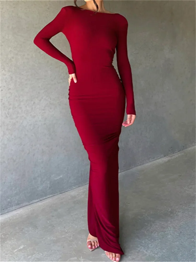 Women Long Bodycon Dress Solid Color Deep V-Neck Ruched Long Sleeve Dress Spring Fall Evening Party Dress
