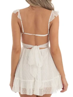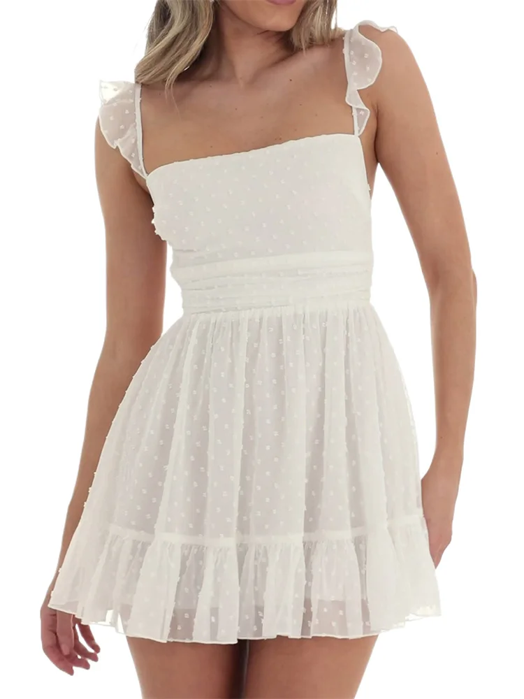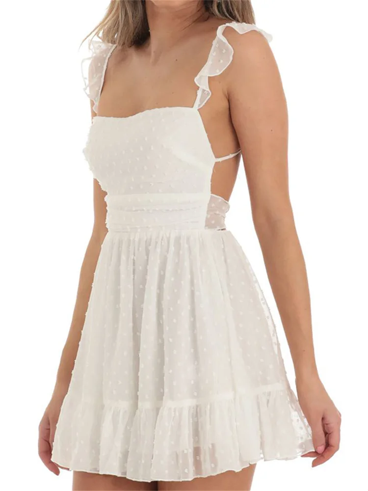 Women Summer Casual Mini Dress Swiss Dot Fly Sleeve Tie-Up Backless Dress Beach Holiday Party Short Dress